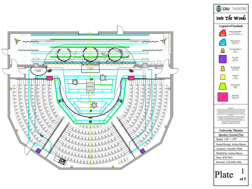 Our design mirrored the characters growth arcs by setting Act One in a lighthearted "Disney" style fairy tale forest. As the show progresses the woods become darker so we set Act Two in a dark woodland "Brothers Grimm" style fantasy. The Sound Design utilized highly stylized sound effects to emphasize the magic of the show and acted to balance the two acts by slowly introducing darker elements that make up Act 2 throughout the show. We placed subwoofers in the house to bring the Giants footsteps to the audience and utilized backstage fx speakers aimed into the walls to create a distant ambient sound for the forest.